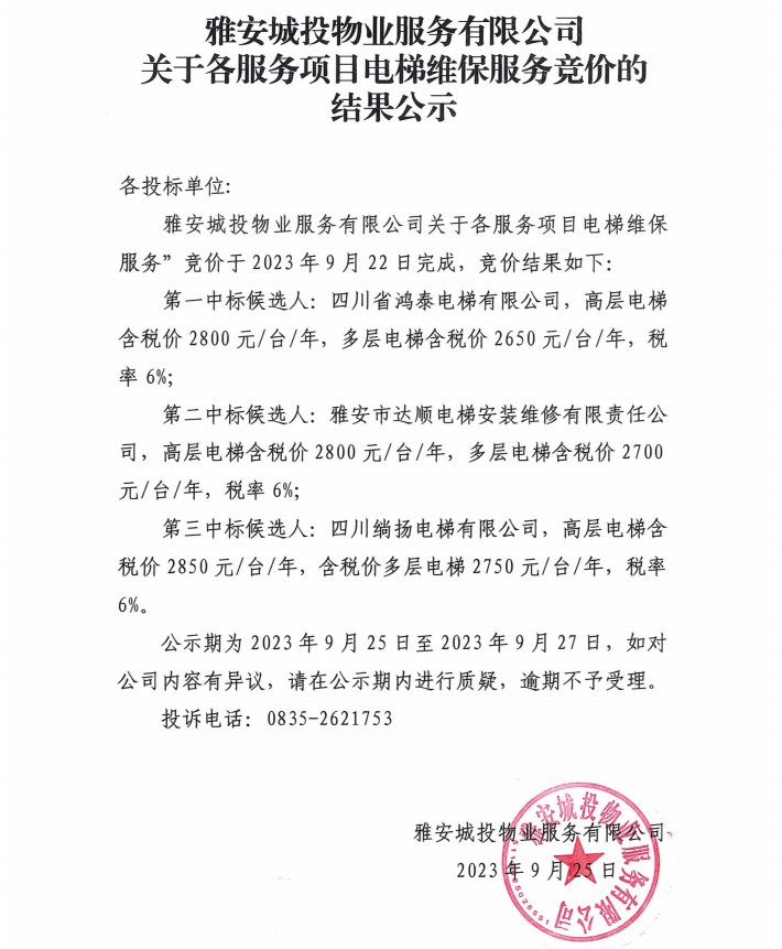雅安城投物業(yè)服務有限公司關于各服務項目電梯維保服務競價的結(jié)果公示