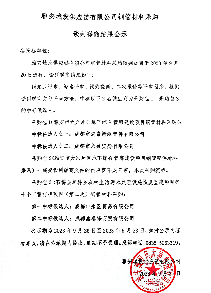 雅安城投供應(yīng)鏈有限公司鋼管材料采購(gòu)談判磋商結(jié)果公示