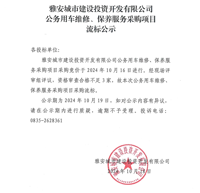 雅安城市建設投資開發(fā)有限公司公務用車維修、保養(yǎng)服務采購項目流標公示