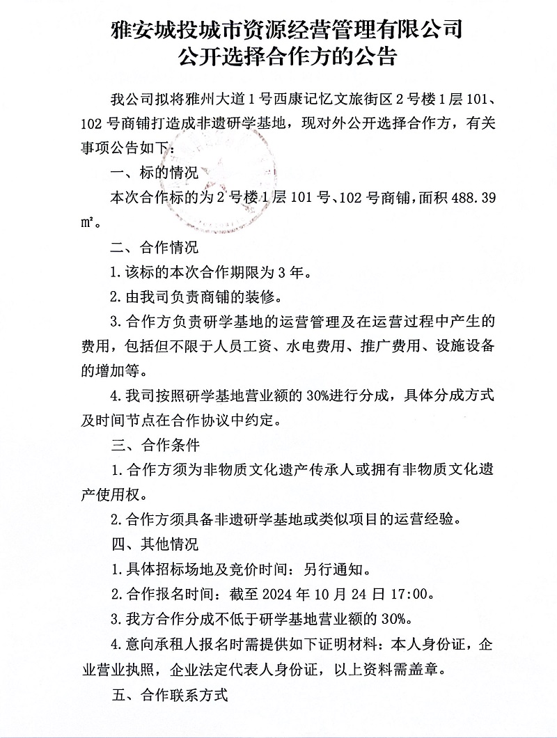 雅安城投城市資源經(jīng)營管理有限公司公開選擇合作方的公告