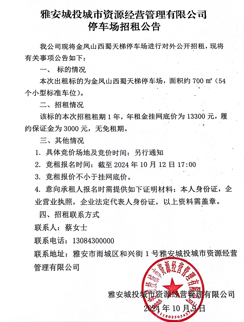 雅安城投城市資源經(jīng)營管理有限公司關(guān)于金鳳山西蜀天梯停車場招租的公告
