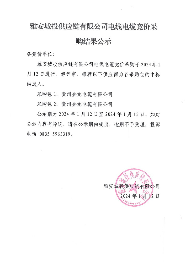 雅安城投供應(yīng)鏈有限公司電線電纜競(jìng)價(jià)采購結(jié)果公示