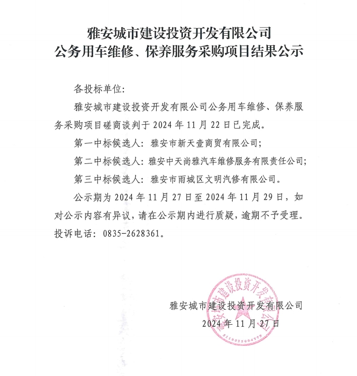 雅安城市建設(shè)投資開發(fā)有限公司公務(wù)用車維修、保養(yǎng)服務(wù)采購項目結(jié)果公示