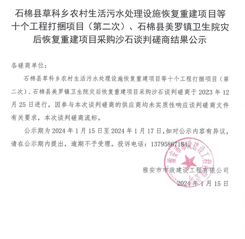 石棉縣草科鄉(xiāng)農(nóng)村生活污水處理設(shè)施恢復(fù)重建項(xiàng)目等十個(gè)工程打捆項(xiàng)目(第二次)、石棉縣美羅鎮(zhèn)衛(wèi)生院災(zāi)后恢復(fù)重建項(xiàng)目采購沙石談判磋商結(jié)果公示