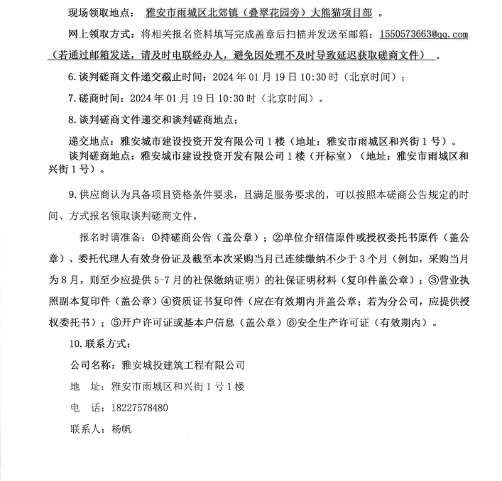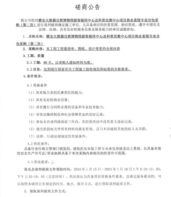 雅安大熊貓自然博物館游客接待中心及科普宣教中心項目熱水系統(tǒng)專業(yè)分包采購(第二次)磋商公告