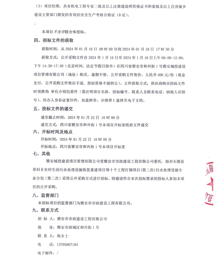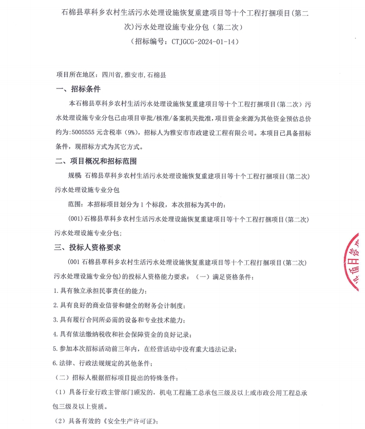 石棉縣草科鄉(xiāng)農(nóng)村生活污水處理設(shè)施恢復(fù)重建項(xiàng)目等十個(gè)工程打捆項(xiàng)目(第二次)污水處理設(shè)施專(zhuān)業(yè)分包競(jìng)價(jià)公告