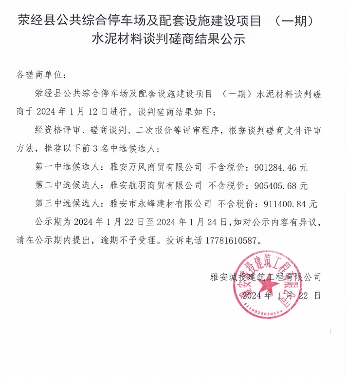 滎經(jīng)縣公共綜合停車場(chǎng)及配套基礎(chǔ)設(shè)施建設(shè)項(xiàng)目(一期)水泥材料談判磋商結(jié)果公示