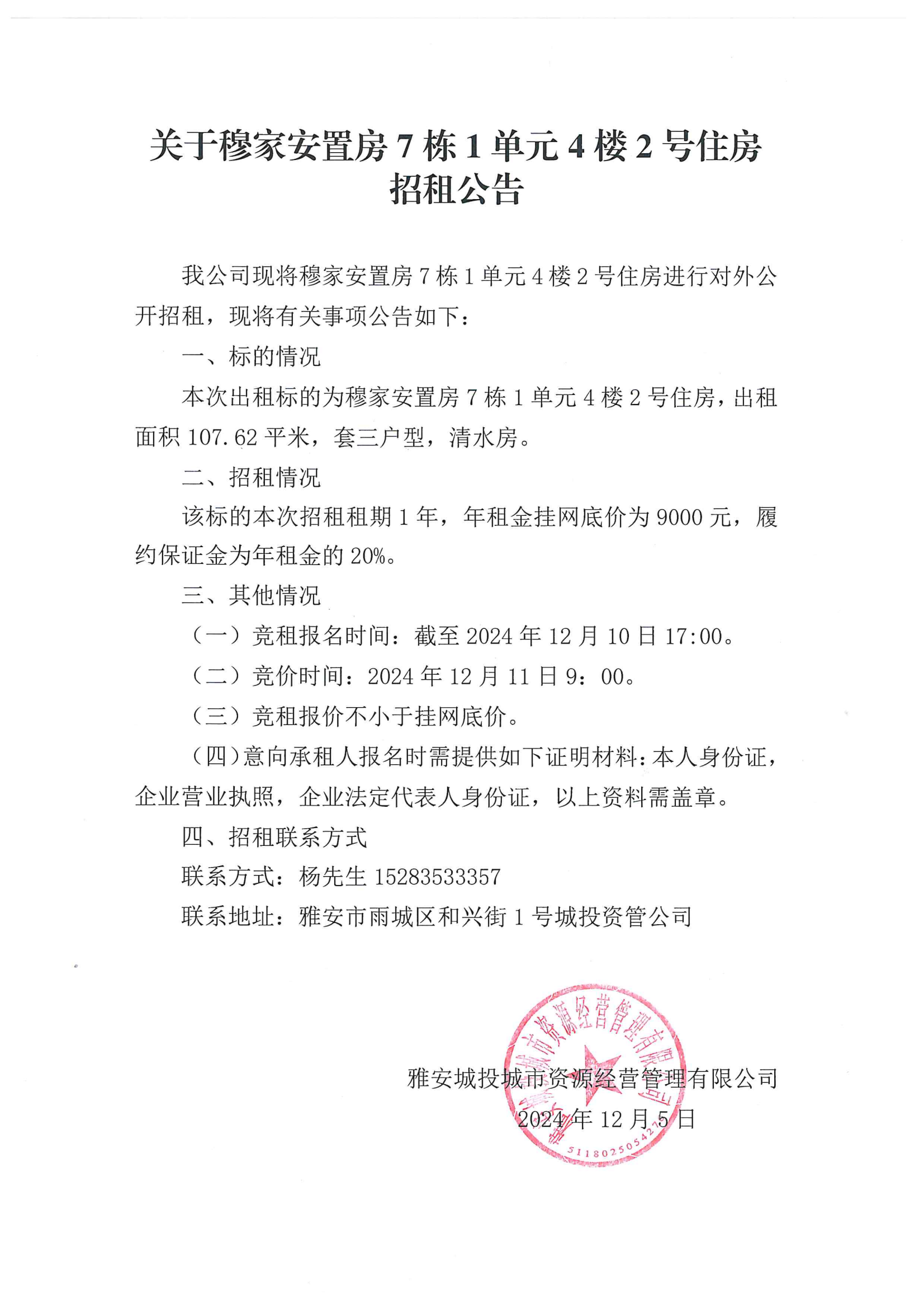 關(guān)于穆家安置房7棟1單元4樓2號住房招租公告