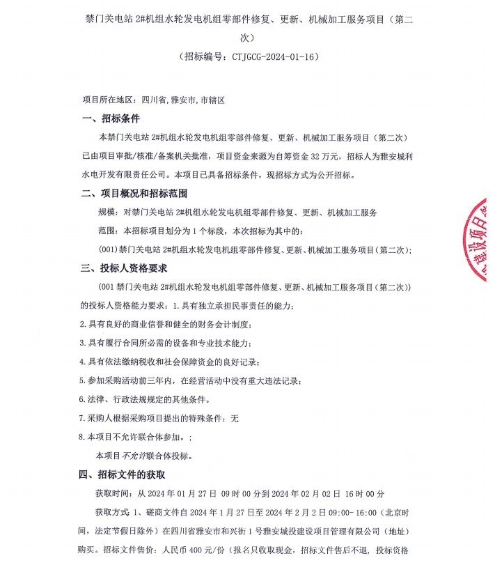 禁門關(guān)電站2#機組水輪發(fā)電機組零部件修復、更新、機械加工服務(wù)項目(第二次)公告