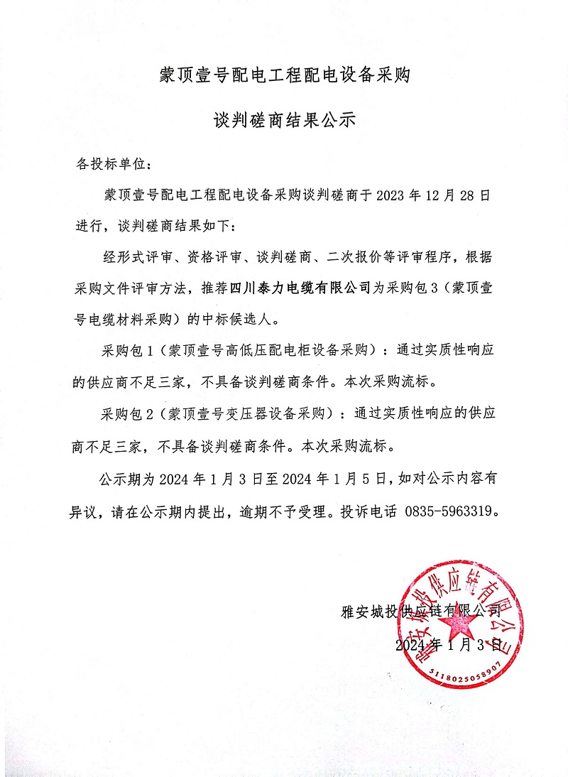 蒙頂壹號配電工程配電設(shè)備采購談判磋商結(jié)果公示