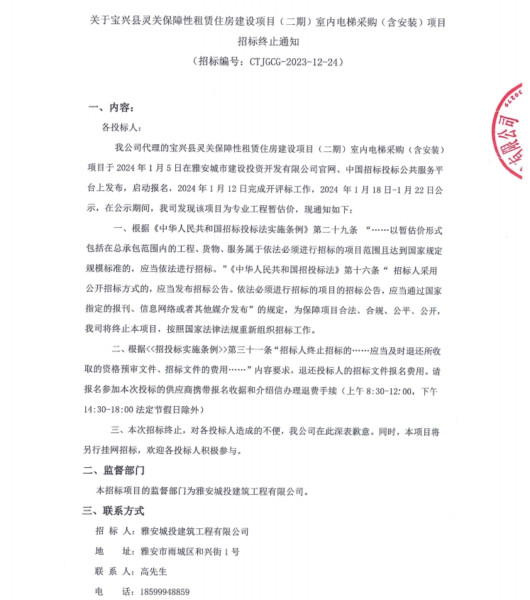 關(guān)于寶興縣靈關(guān)保障性租賃住房建設(shè)項(xiàng)目(二期)室內(nèi)電梯采購(gòu)(含安裝)項(xiàng)目招標(biāo)終止通知