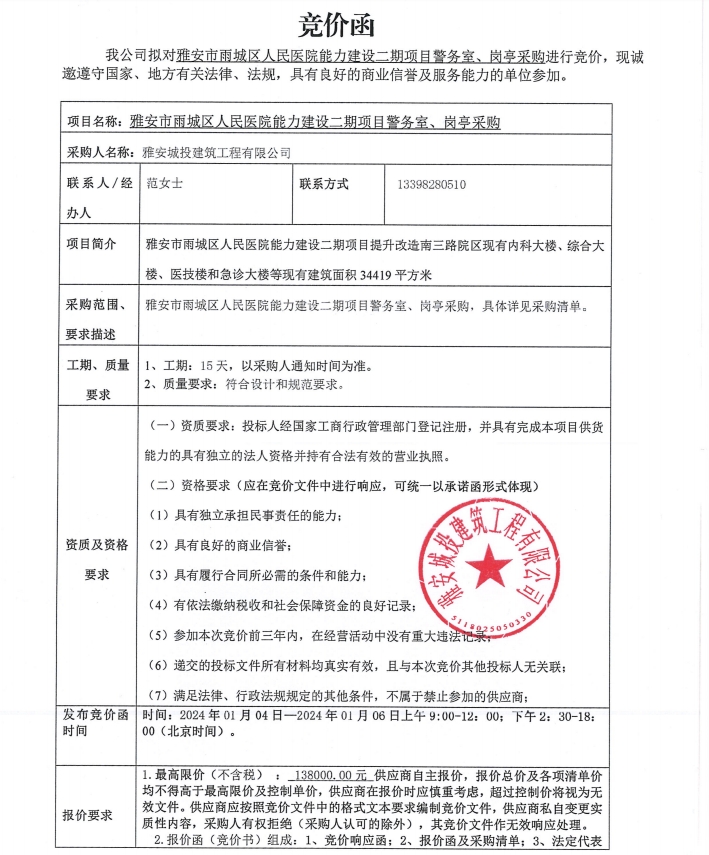 雅安市雨城區(qū)人民醫(yī)院能力建設二期項目警務室、崗亭采購競價公告