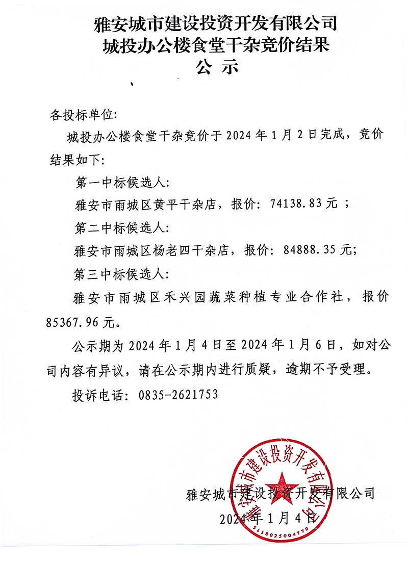 雅安城市建設投資開發(fā)有限公司城投辦公樓食堂干雜競價結果公示