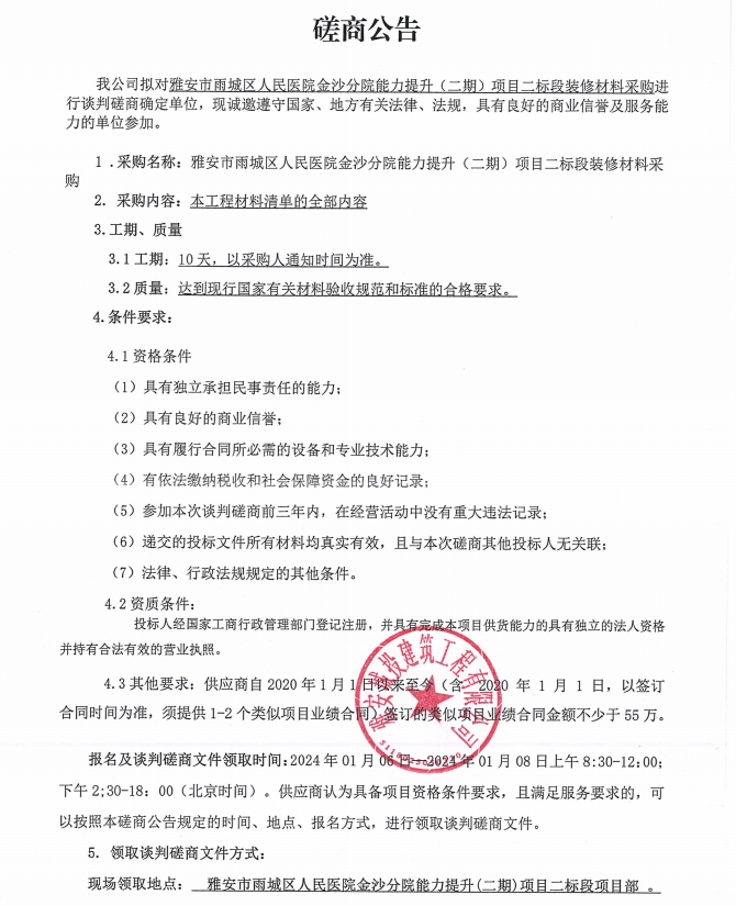 雅安市雨城區(qū)人民醫(yī)院金沙分院能力提升(二期)項(xiàng)目二標(biāo)段裝修材料采購談判磋商公告