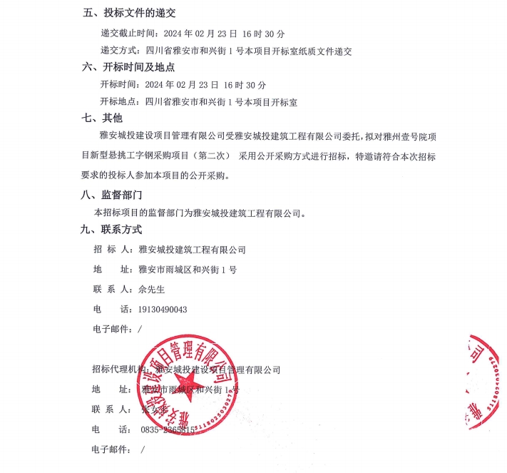 雅州壹號院項目新型懸挑工字鋼采購項目(第二次)公告