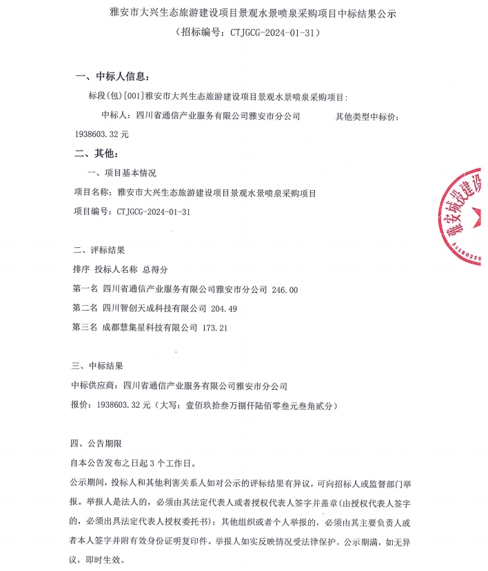 雅安市大興生態(tài)旅游建設(shè)項目景觀水景噴泉采購項目中標(biāo)結(jié)果公示