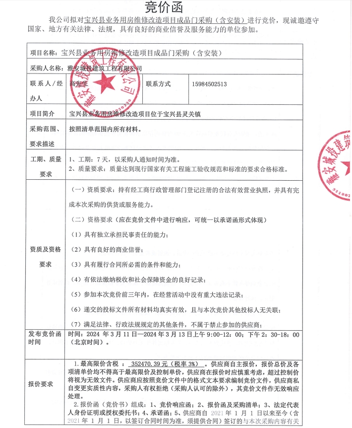 寶興縣業(yè)務(wù)用房維修改造項目成品門采購(含安裝)競價公告