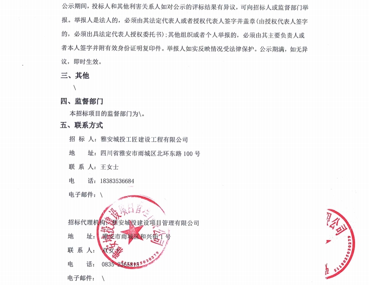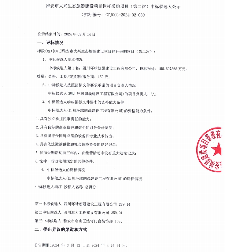 雅安市大興生態(tài)旅游建設項目欄桿采購項目(第二次)中標候選人公示