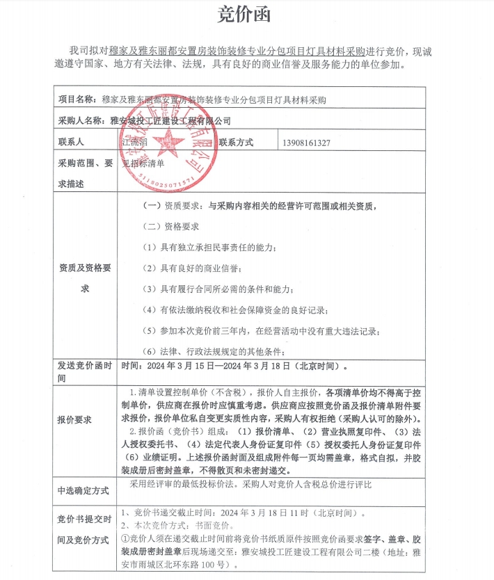 穆家及雅東麗都安置房裝飾裝修專業(yè)分包項(xiàng)目燈具材料采購(gòu)競(jìng)價(jià)公告