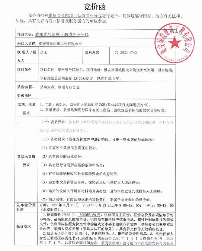 雅州壹號(hào)院項(xiàng)目煙道專業(yè)分包競(jìng)價(jià)公告