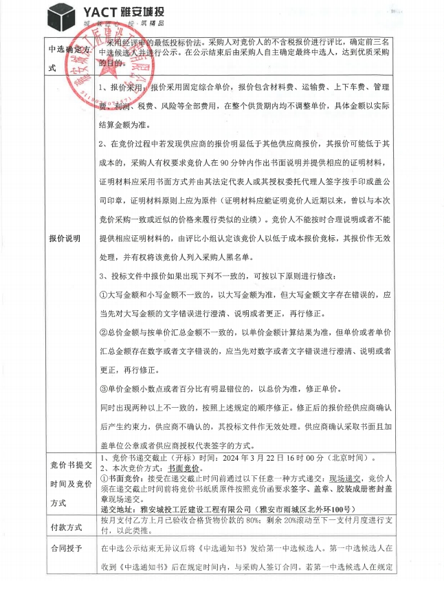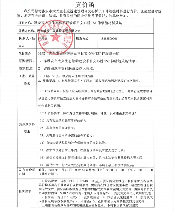 雅安市大興生態(tài)旅游建設項目文心橋TST橋梁伸縮縫材料采購競價公告