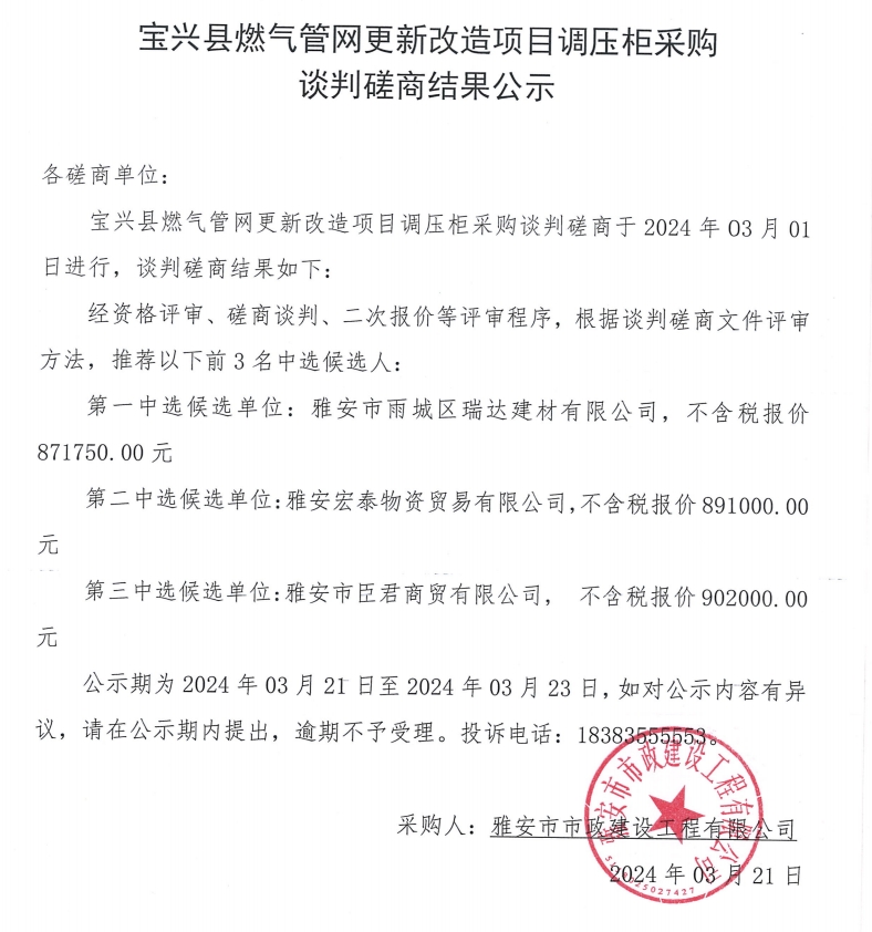 寶興縣燃?xì)夤芫W(wǎng)更新改造項(xiàng)目調(diào)壓柜采購談判磋商結(jié)果公示