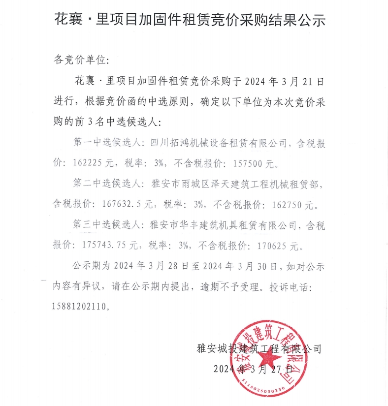 花襄·里項目加固件租賃競價采購結果公示