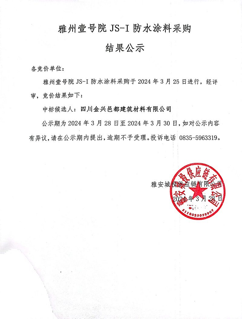 雅州壹號(hào)院JS-I防水涂料采購(gòu)結(jié)果公示