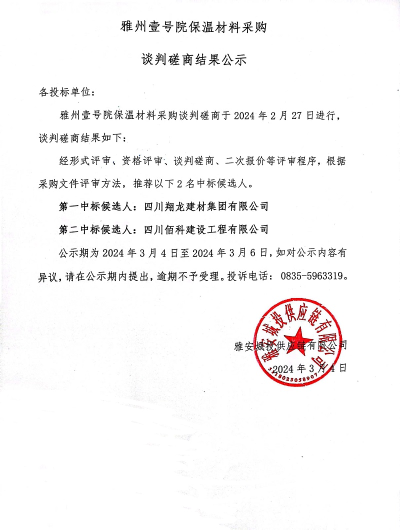 雅州壹號院保溫材料采購談判磋商結(jié)果公示