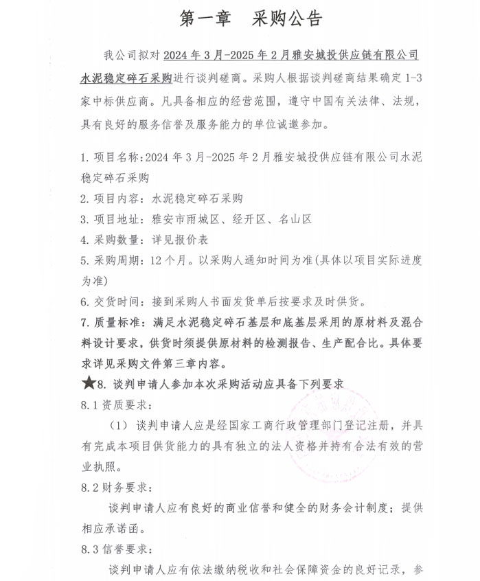 2024年3月-2025年2月雅安城投供應(yīng)鏈有限公司水泥穩(wěn)定碎石采購公告