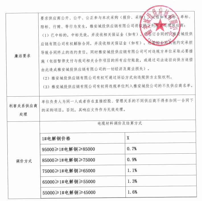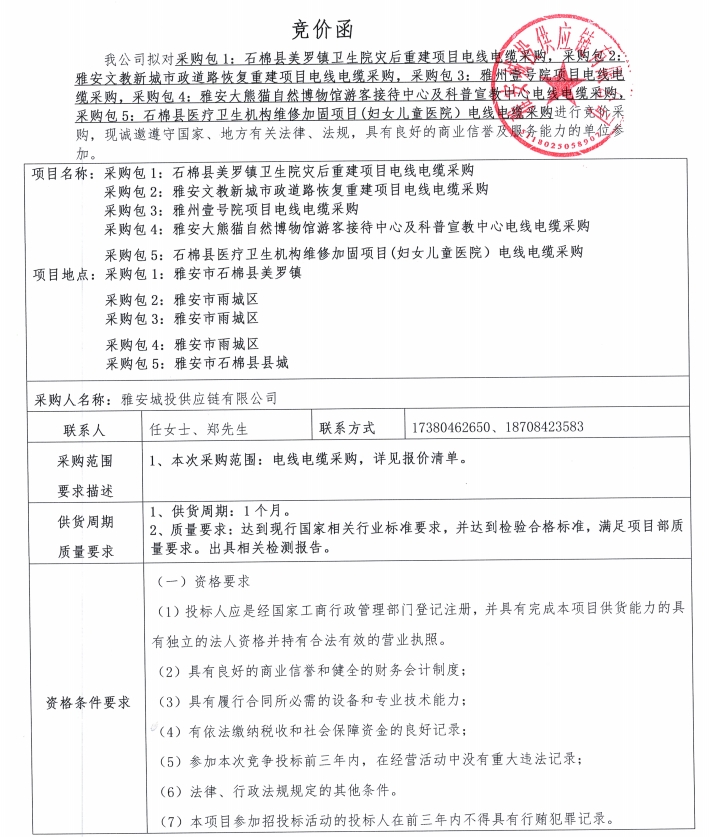 雅安城投供應(yīng)鏈有限公司電線電纜采購(gòu)競(jìng)價(jià)公告