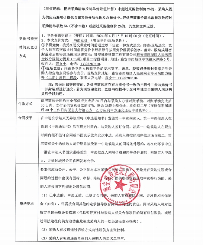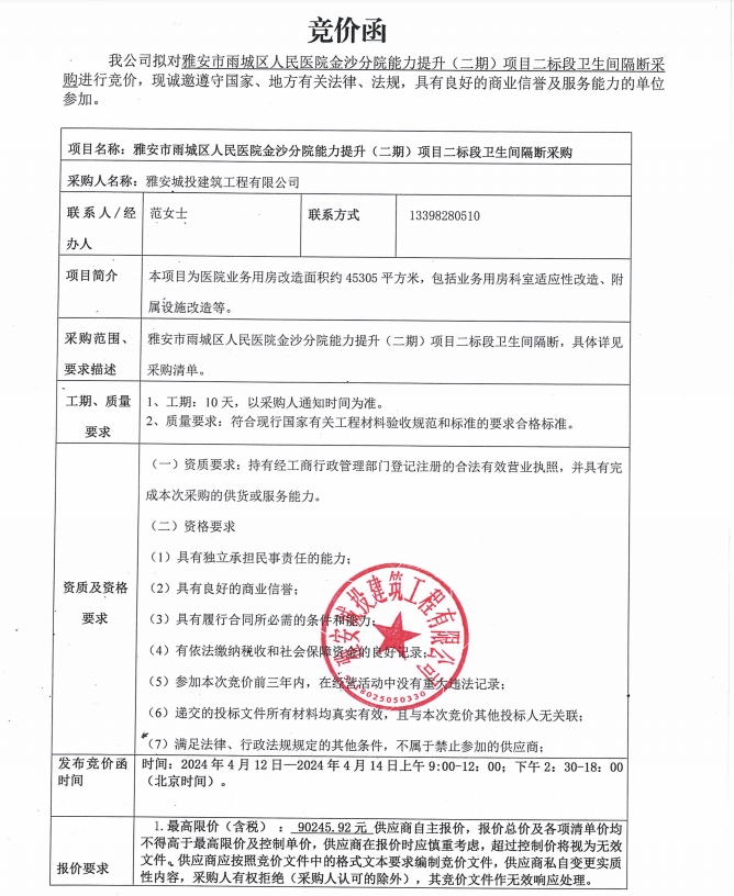 雅安市雨城區(qū)人民醫(yī)院金沙分院能力提升(二期)項目二標(biāo)段衛(wèi)生間隔斷采購競價公告
