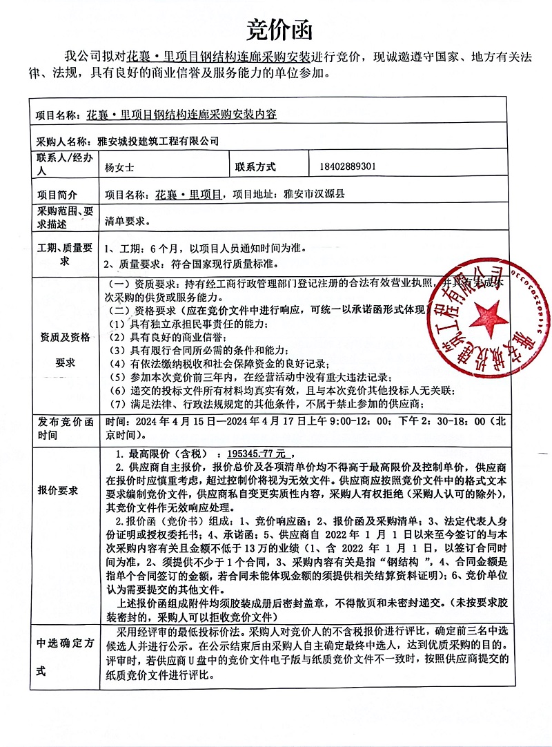 花襄·里項(xiàng)目鋼結(jié)構(gòu)連廊采購安裝競價公告