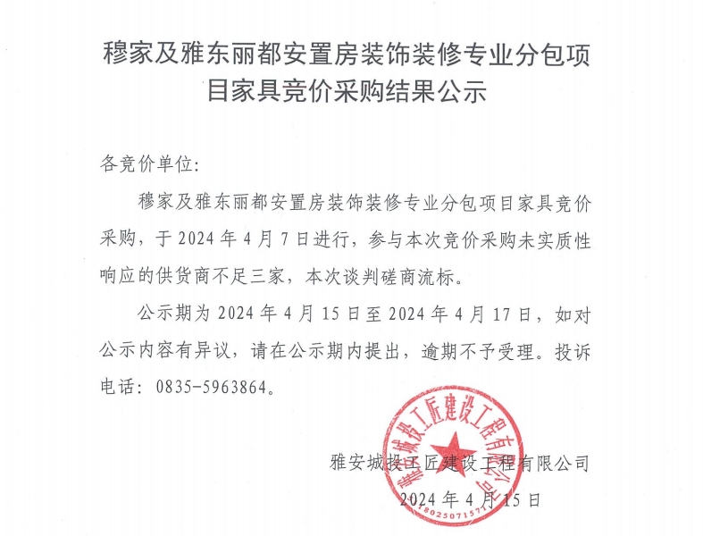 穆家及雅東麗都安置房裝飾裝修專(zhuān)業(yè)分包項(xiàng)目家具競(jìng)價(jià)采購(gòu)結(jié)果公示