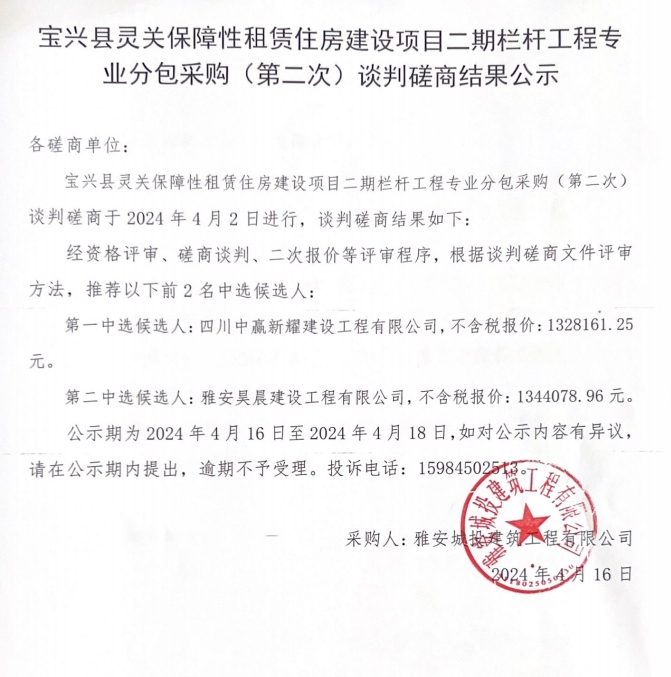 寶興縣靈關(guān)保障性租賃住房建設(shè)項目二期欄桿工程專業(yè)分包采購(第二次)談判磋商結(jié)果公示
