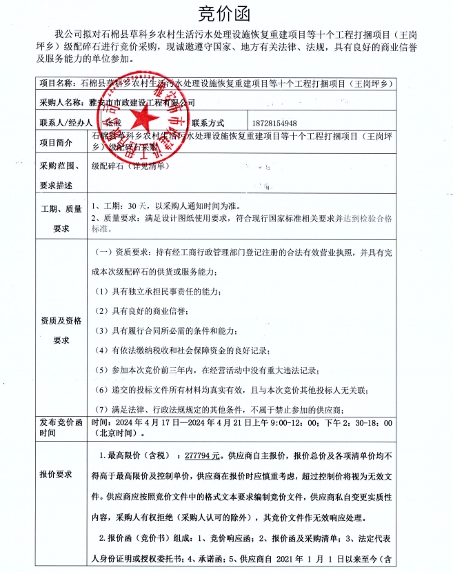 石棉縣草科鄉(xiāng)農(nóng)村生活污水處理設(shè)施恢復(fù)重建項(xiàng)目等十個工程打捆項(xiàng)目(王崗坪鄉(xiāng))級配碎石競價公告