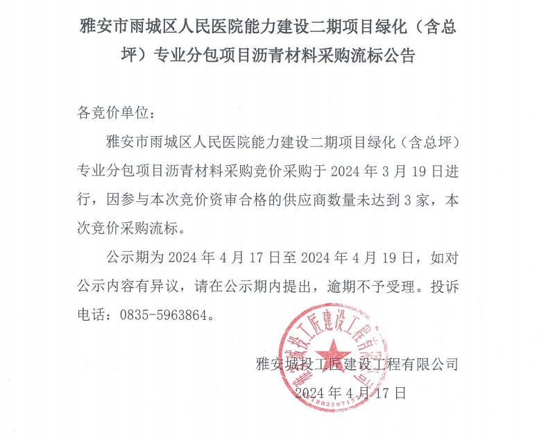雅安市雨城區(qū)人民醫(yī)院能力建設(shè)二期項(xiàng)目綠化(含總坪)專業(yè)分包項(xiàng)目瀝青材料采購(gòu)流標(biāo)公告