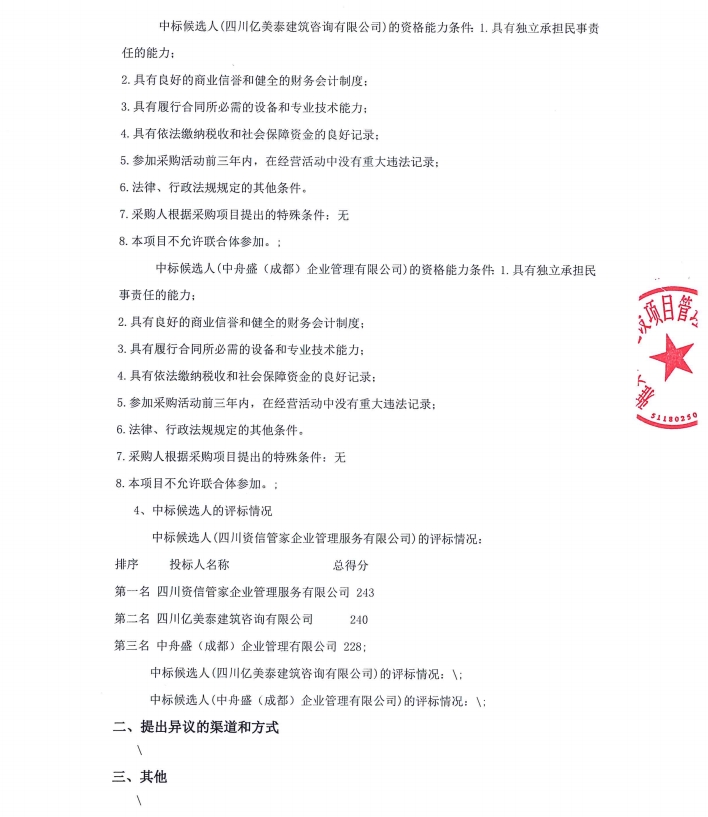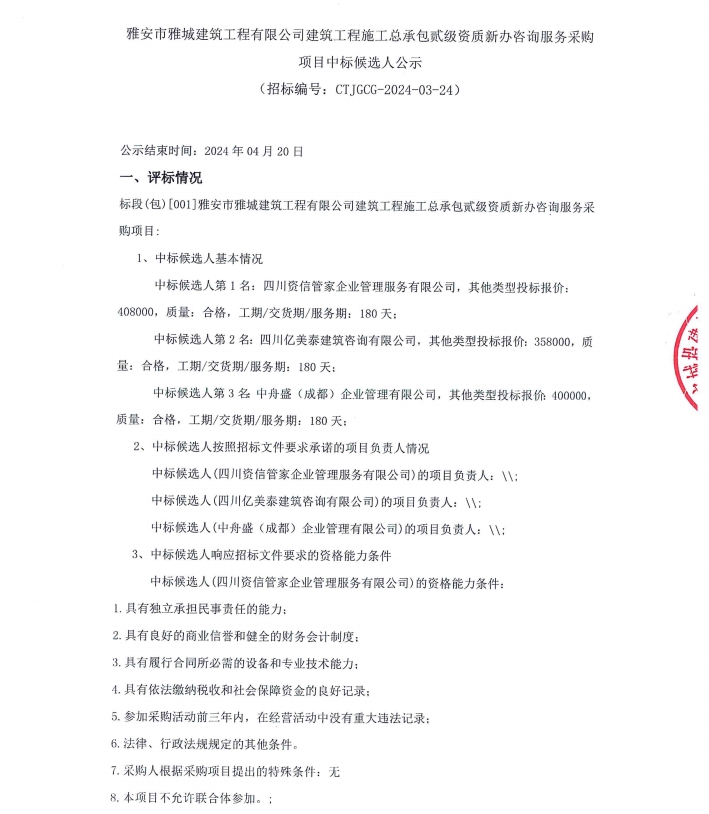 雅安市雅城建筑工程有限公司建筑工程施工總承包貳級資質(zhì)新辦咨詢服務(wù)采購項目中標候選人公示