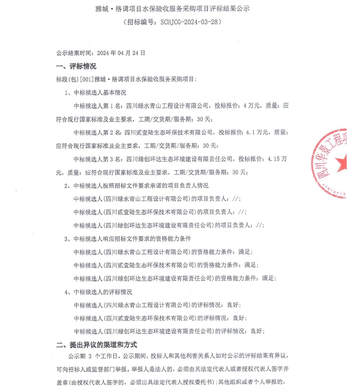 雅城·格調(diào)項(xiàng)目水保驗(yàn)收服務(wù)采購(gòu)項(xiàng)目評(píng)標(biāo)結(jié)果公示