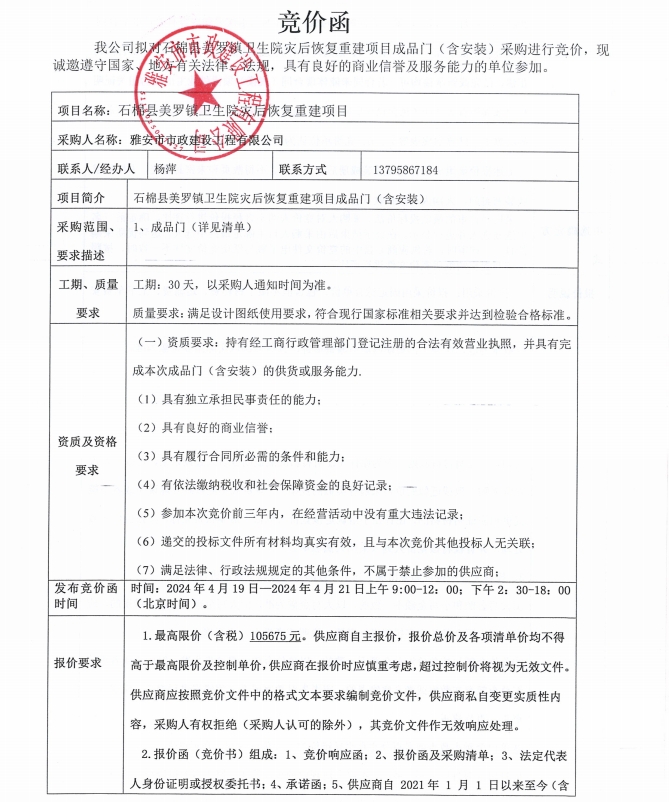石棉縣美羅鎮(zhèn)衛(wèi)生院災(zāi)后恢復(fù)重建項(xiàng)目競價(jià)公告