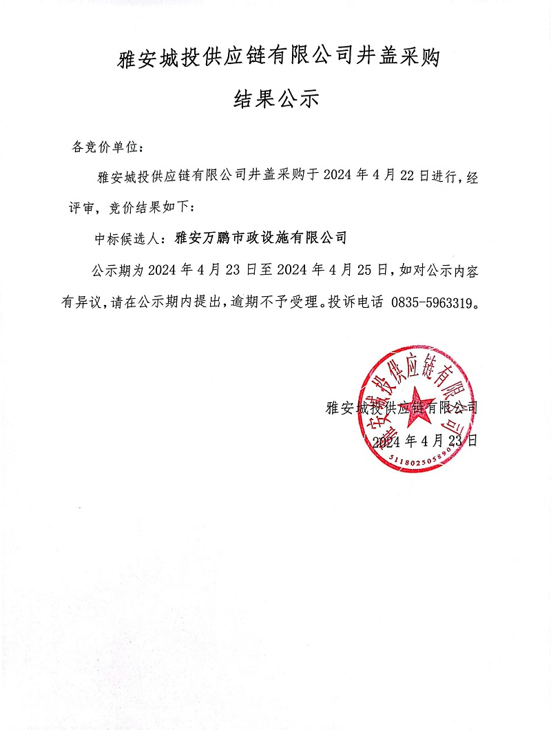 雅安城投供應(yīng)鏈有限公司井蓋采購結(jié)果公示