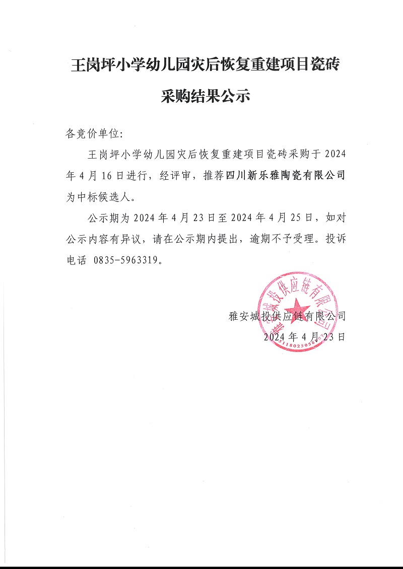 王崗坪小學幼兒園災后恢復重建項目瓷磚采購結果公示