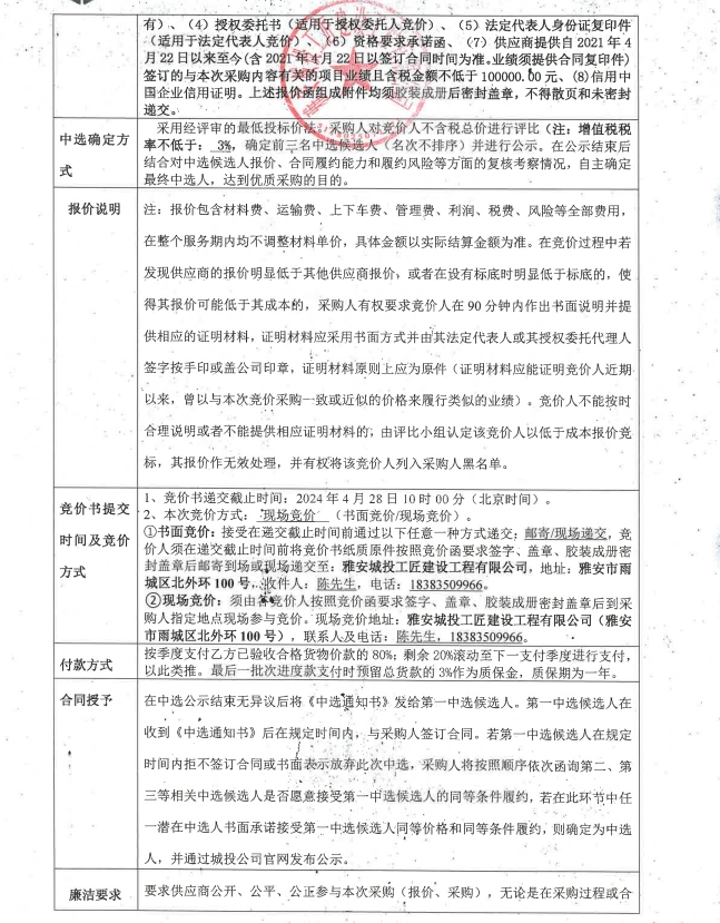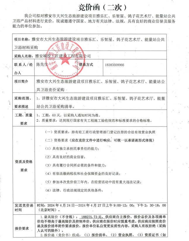 雅安市大興生態(tài)旅游建設(shè)項(xiàng)目雅樂匯、樂智屋、鴿子花藝術(shù)廳、能量站公共衛(wèi)浴材料采購(第二次)競(jìng)價(jià)公告