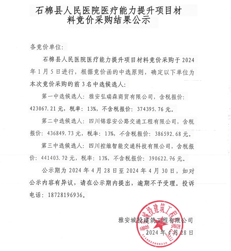 石棉縣人民醫(yī)院醫(yī)療能力提升項(xiàng)目材料競價(jià)采購結(jié)果公示