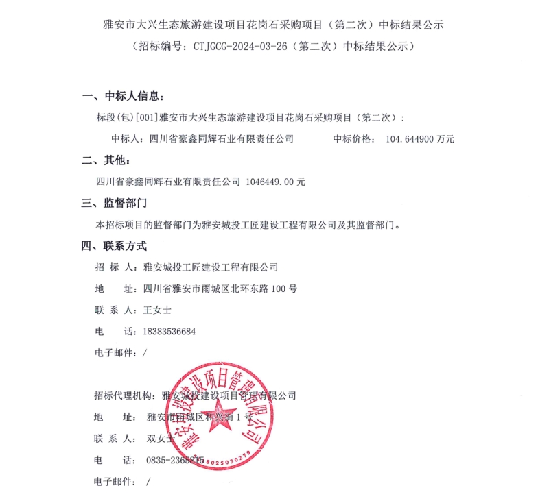 雅安市大興生態(tài)旅游建設(shè)項(xiàng)目花崗石采購(gòu)項(xiàng)目(第二次)中標(biāo)結(jié)果公示