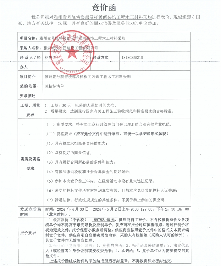 競價函-木工材料采購-雅州壹號院售樓部及樣板間