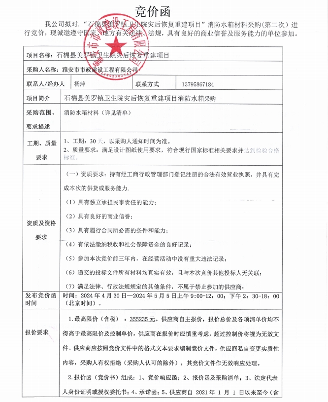 石棉縣美羅鎮(zhèn)衛(wèi)生院災(zāi)后恢復(fù)重建項目消防水箱采購(第二次)競價公告