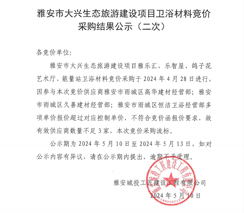 雅安市大興生態(tài)旅游建設項目衛(wèi)浴材料競價采購結(jié)果公示(二次)