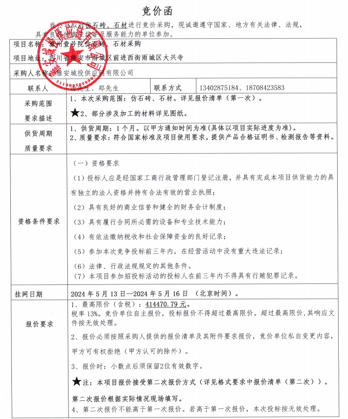 附件1:競(jìng)價(jià)函--雅州壹號(hào)院仿石磚、石材采購(gòu)