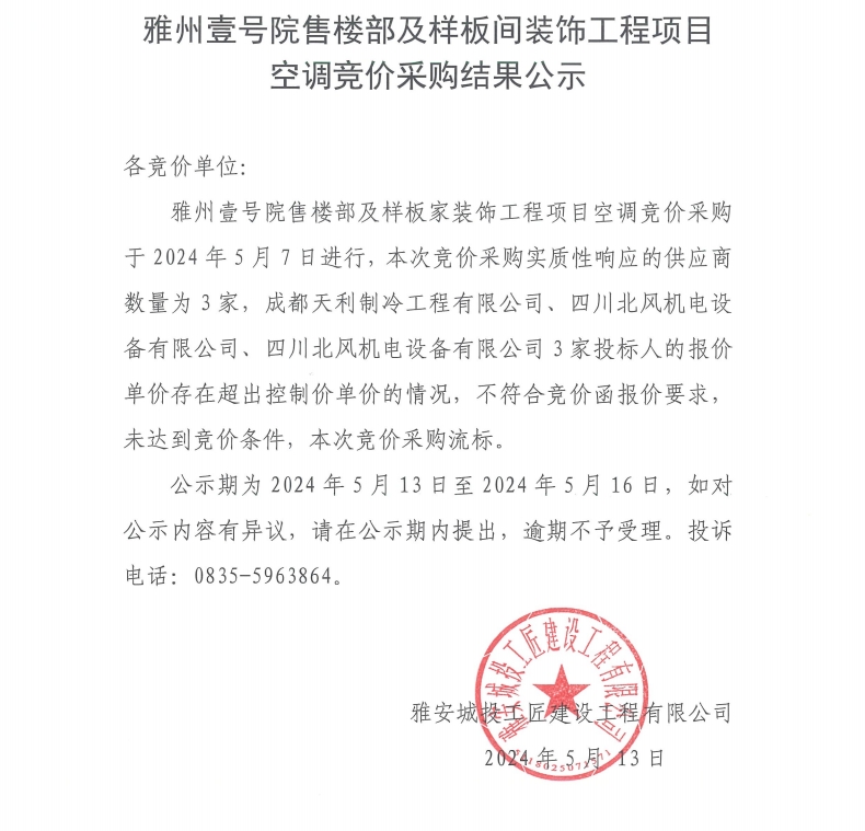 雅州壹號(hào)院售樓部及樣板間裝飾工程空調(diào)競(jìng)價(jià)采購(gòu)結(jié)果公示